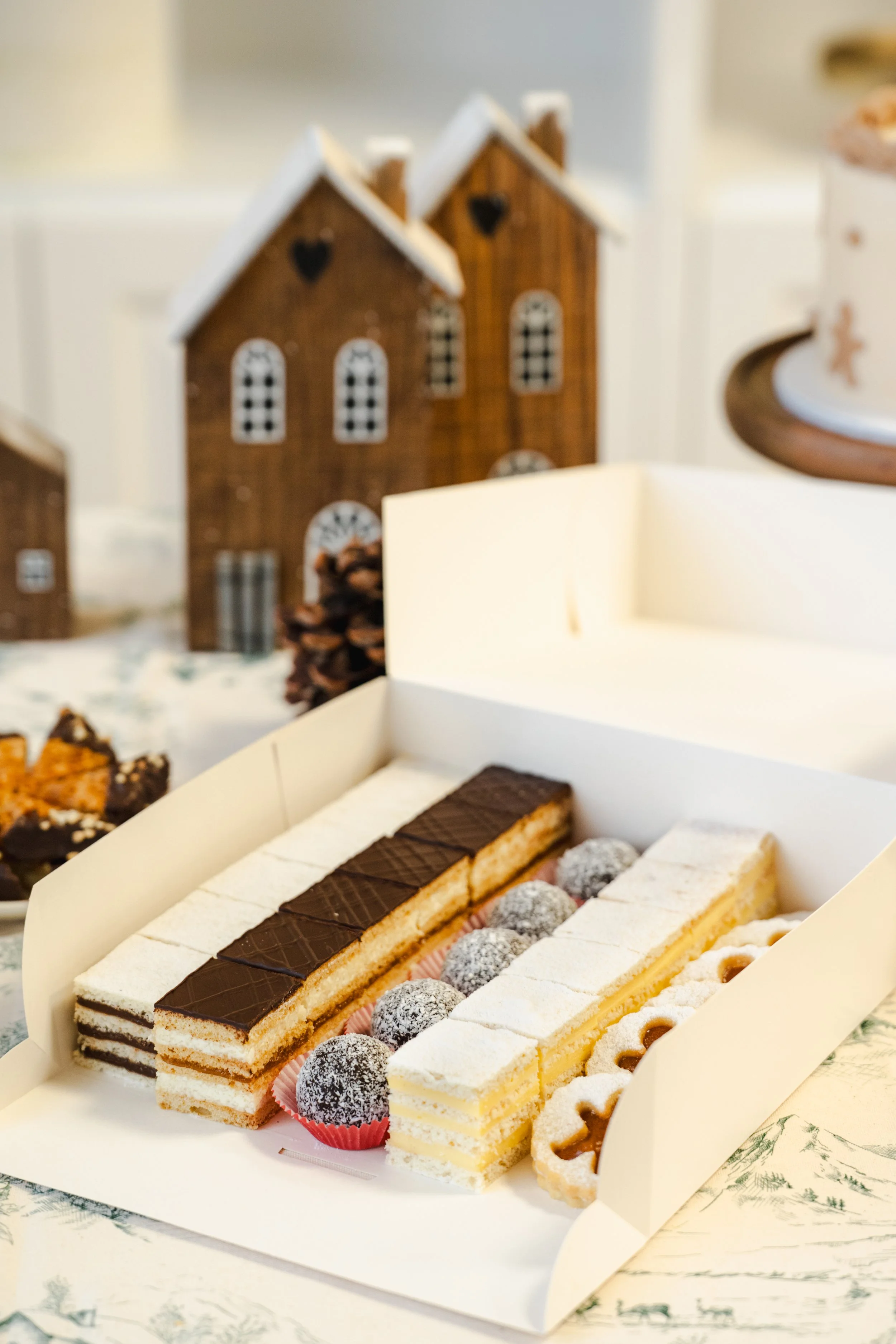 A doboz tartalma: Sacher kocka, csokis-meggyes-gesztenye kocka, isler, áfonyás-kókusz lamington, málnás belgacsoki kocka